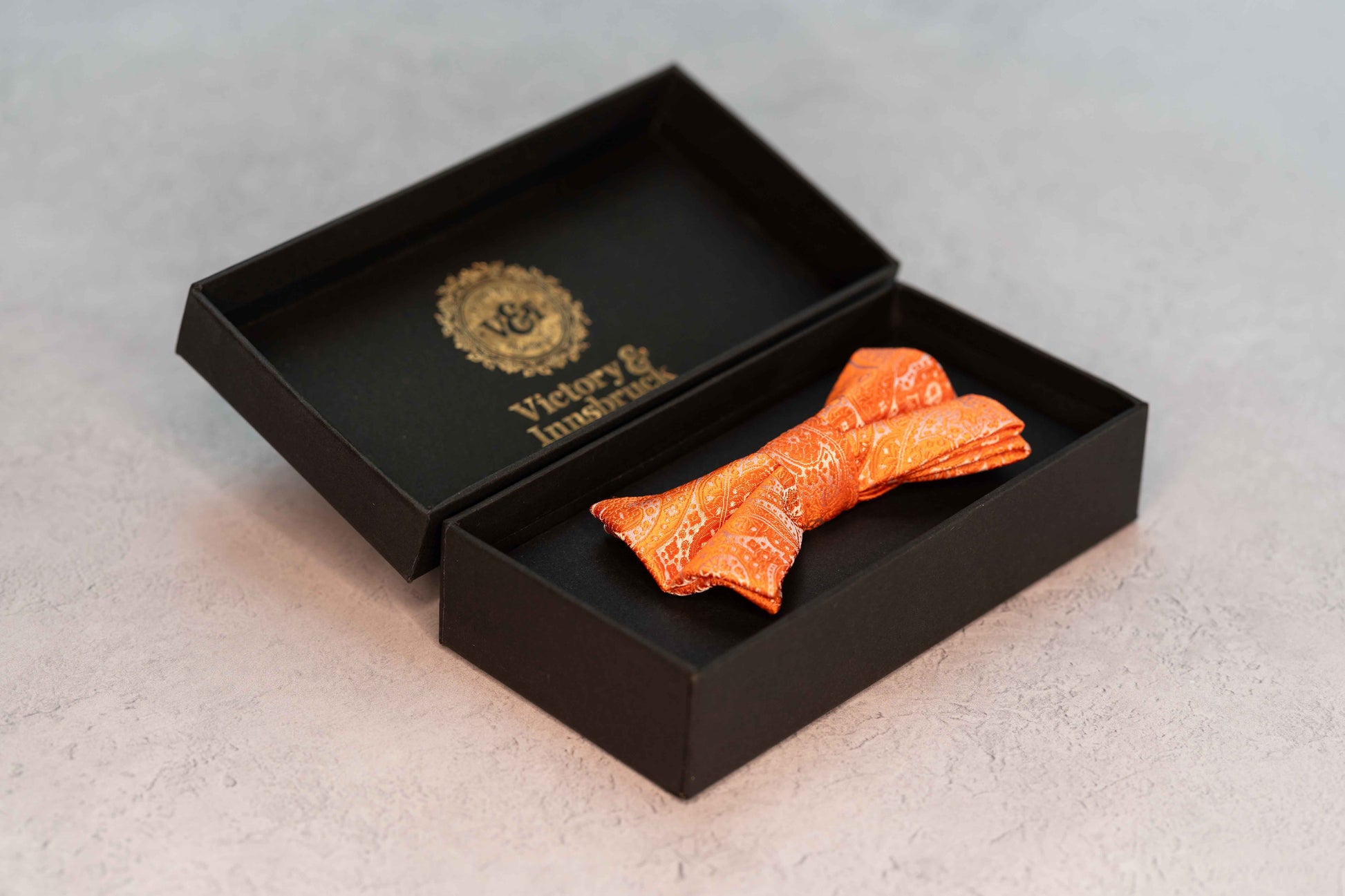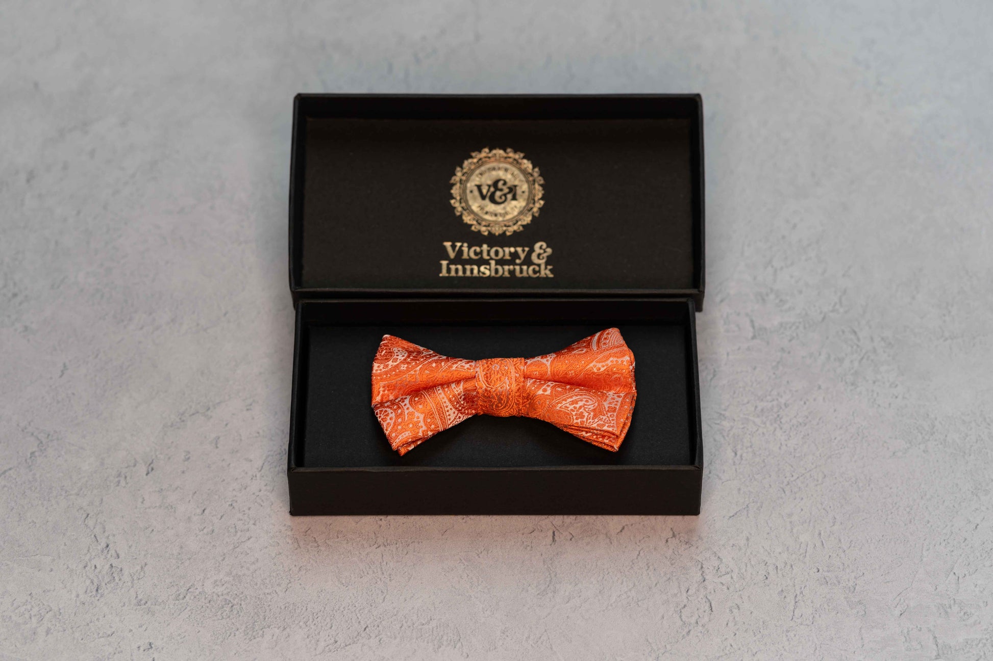 A paisley finish Victory & Innsbruck bow tie in a coral orange colour. Ideal for any special occasion. Clip on fastening for ease and the guaranteed perfect finish.