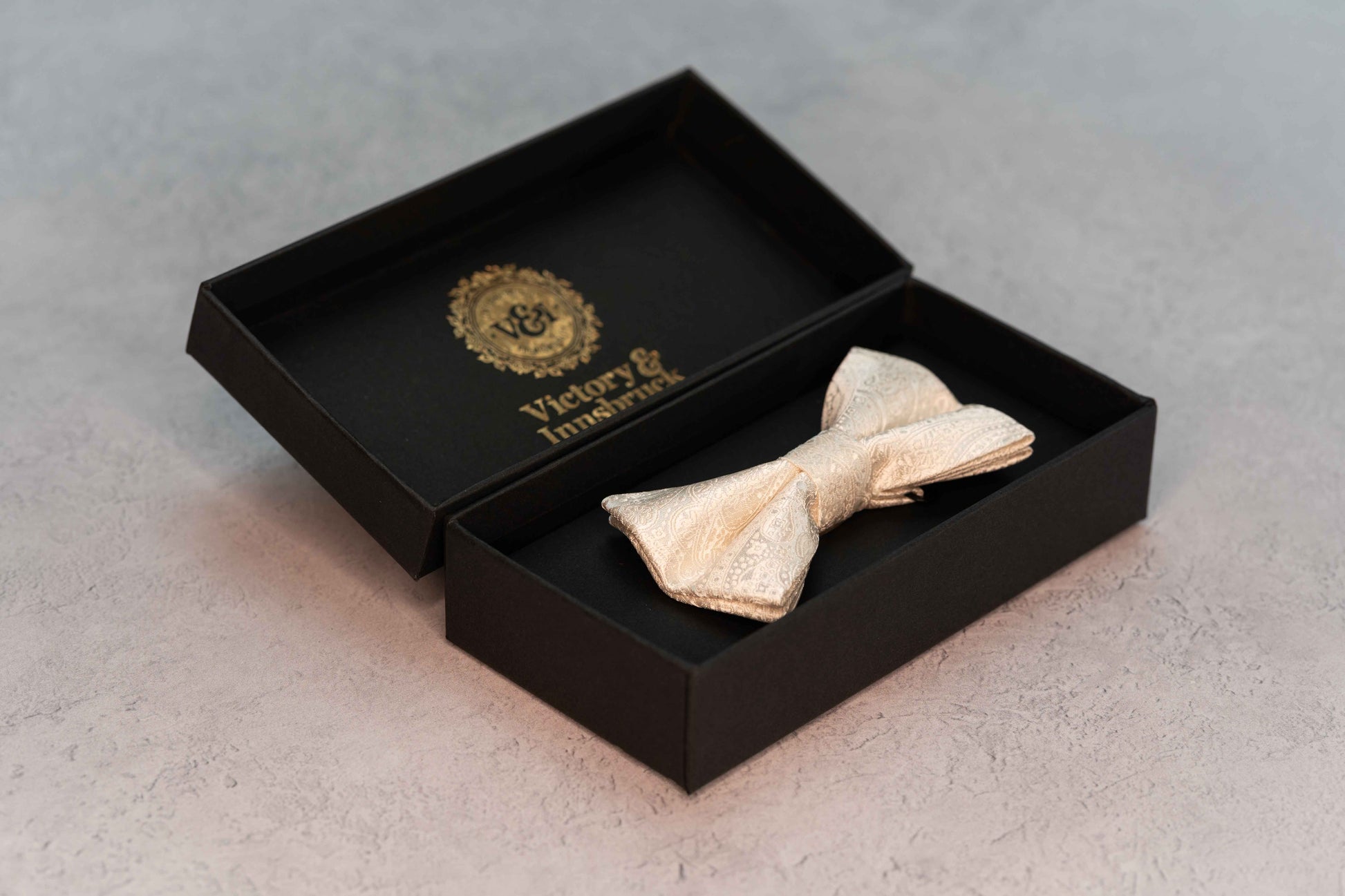 A paisley finish Victory & Innsbruck bow tie in a ivory colour. Ideal for any special occasion. Clip on fastening for ease and the guaranteed perfect finish.