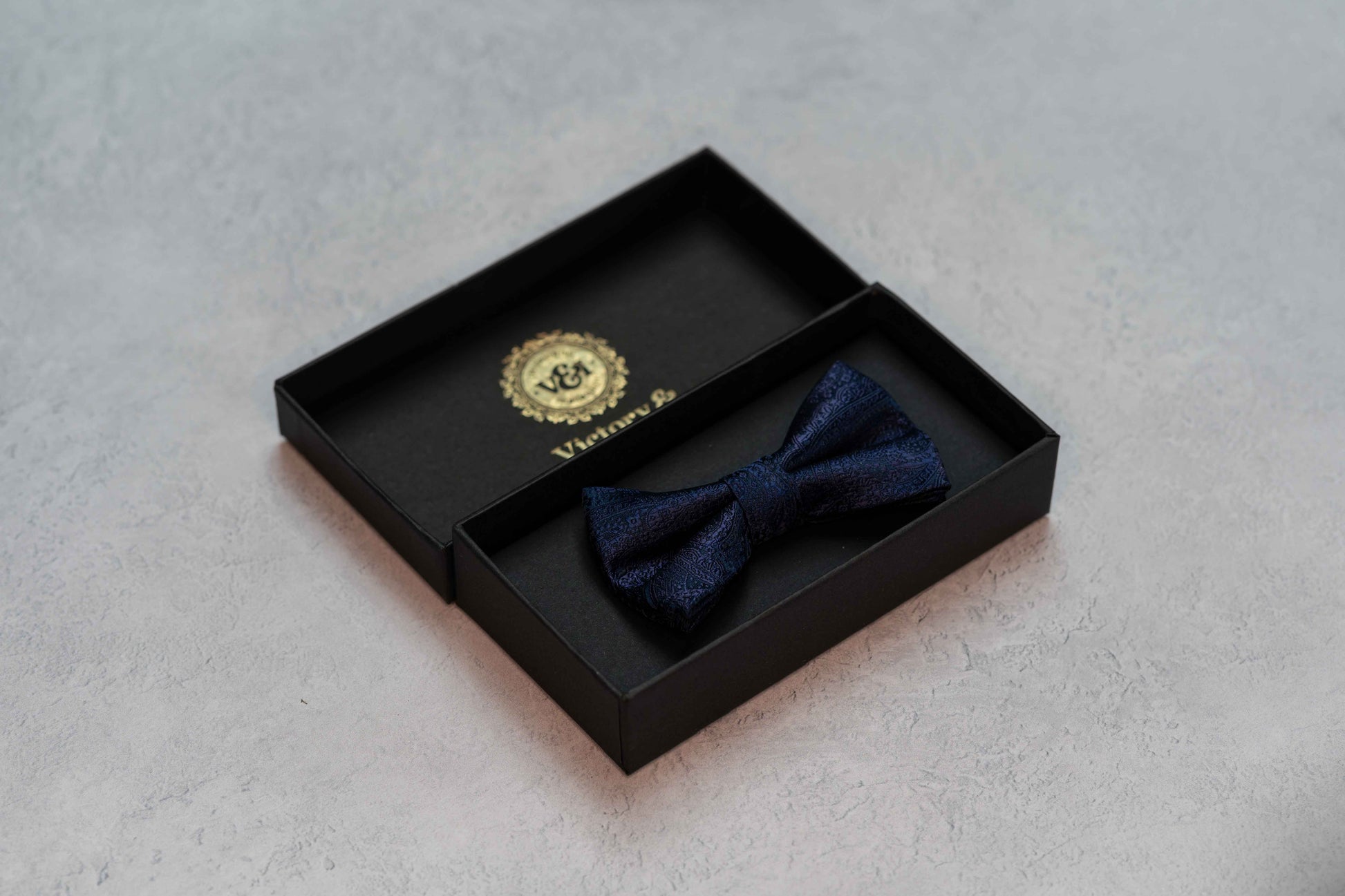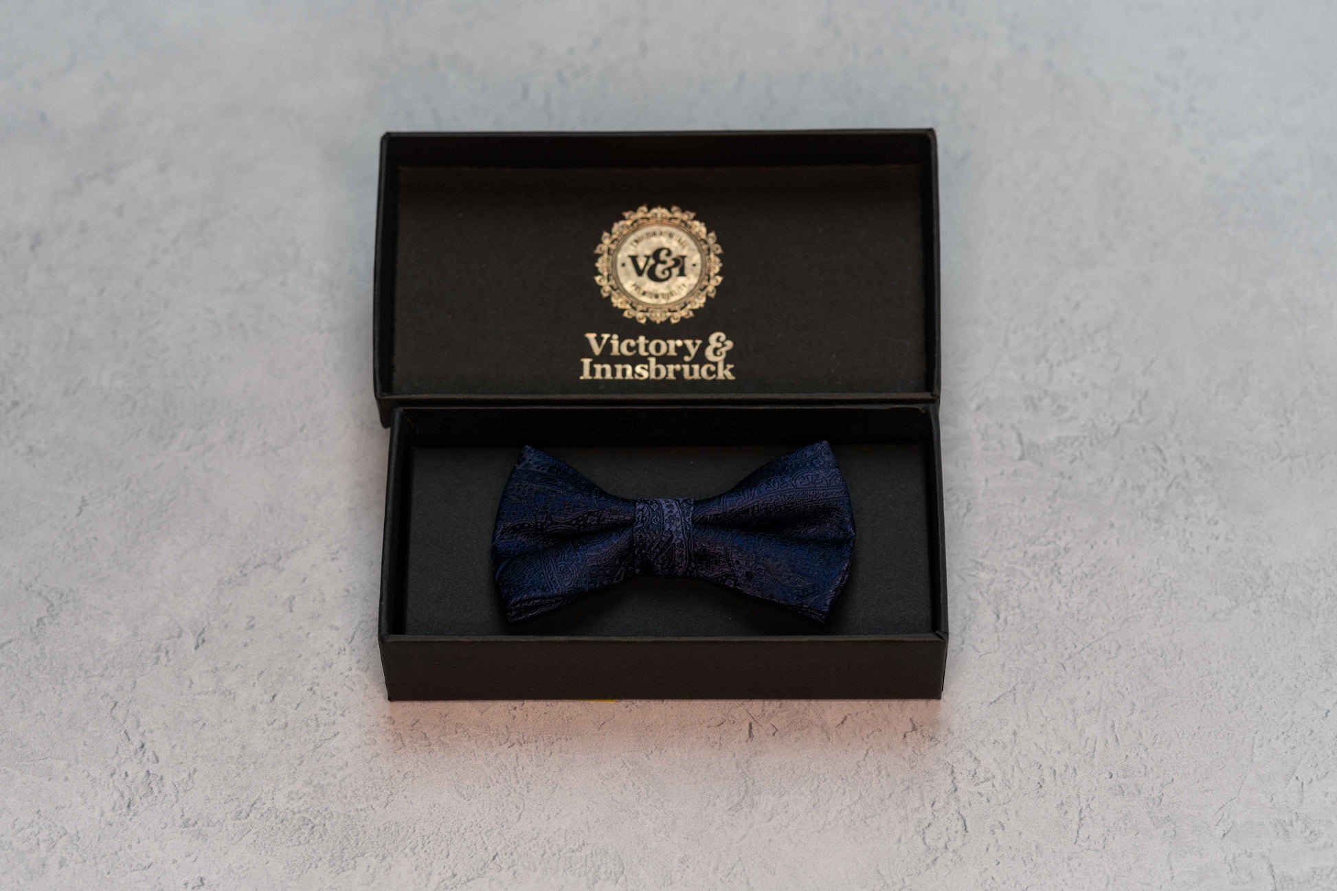 A paisley finish Victory & Innsbruck bow tie in a navy blue colour. Ideal for any special occasion. Clip on fastening for ease and the guaranteed perfect finish.