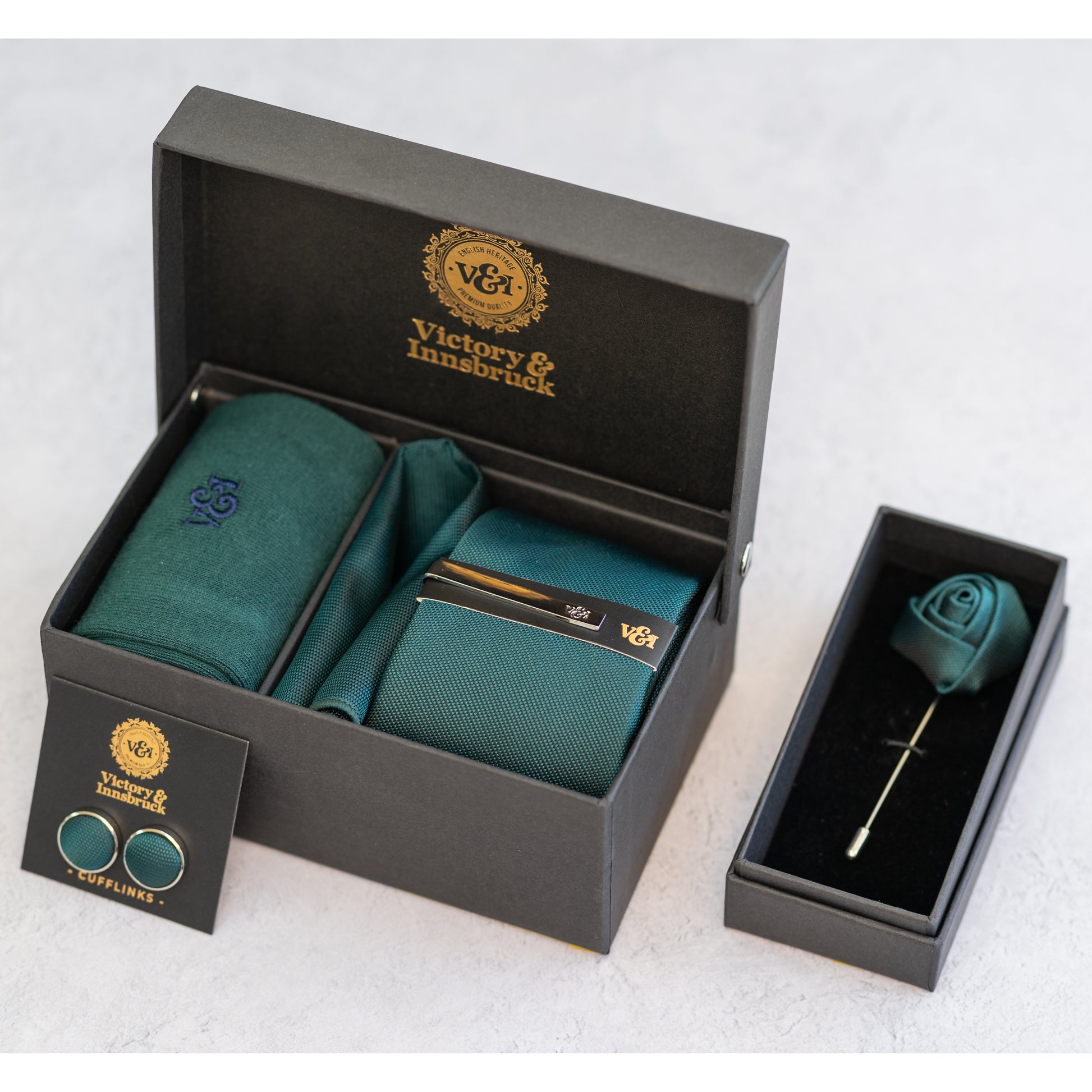 - Full Box Set - Tie, Tie Bar, Pocket Square, Cufflinks and Socks in our signature V&I gift box.