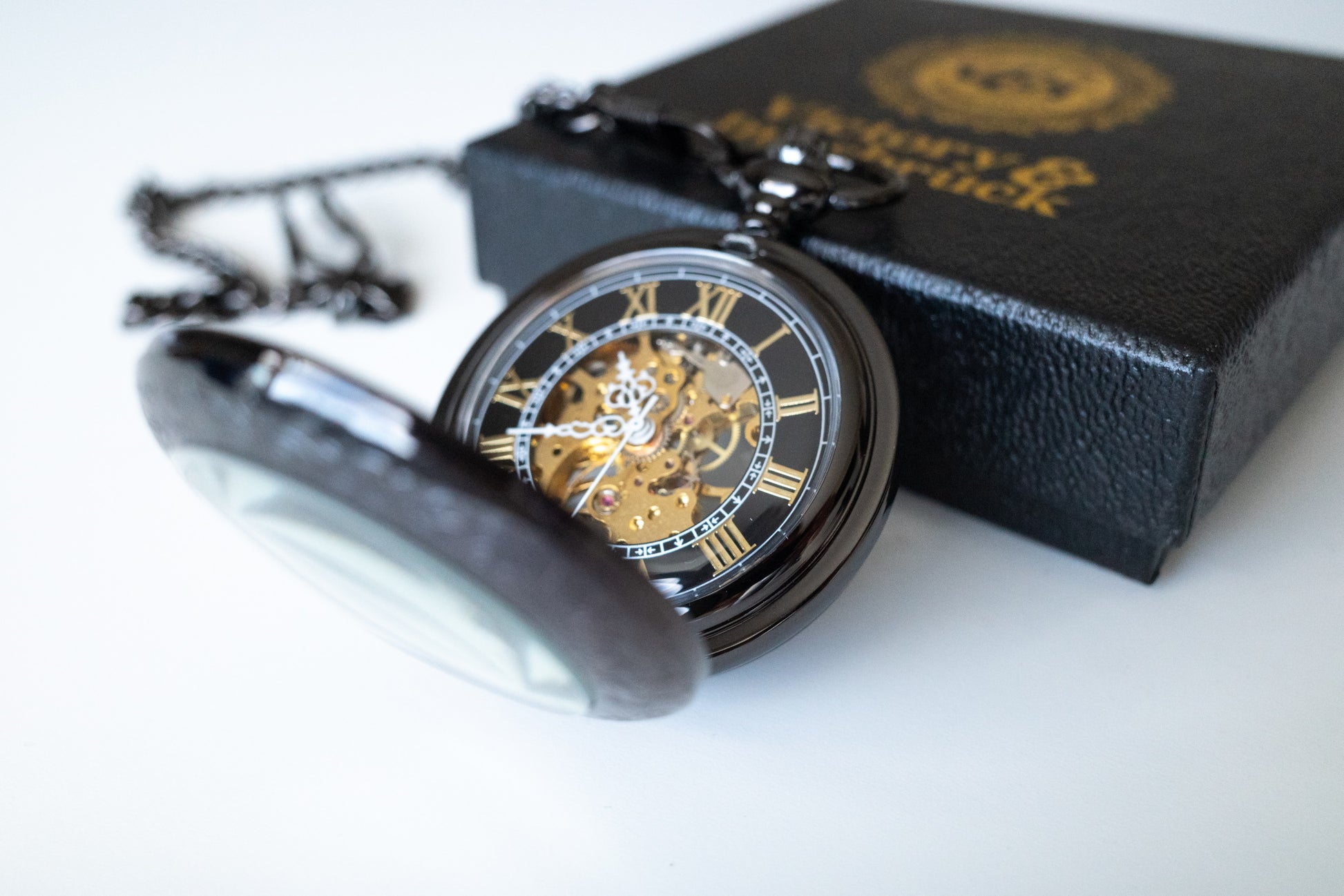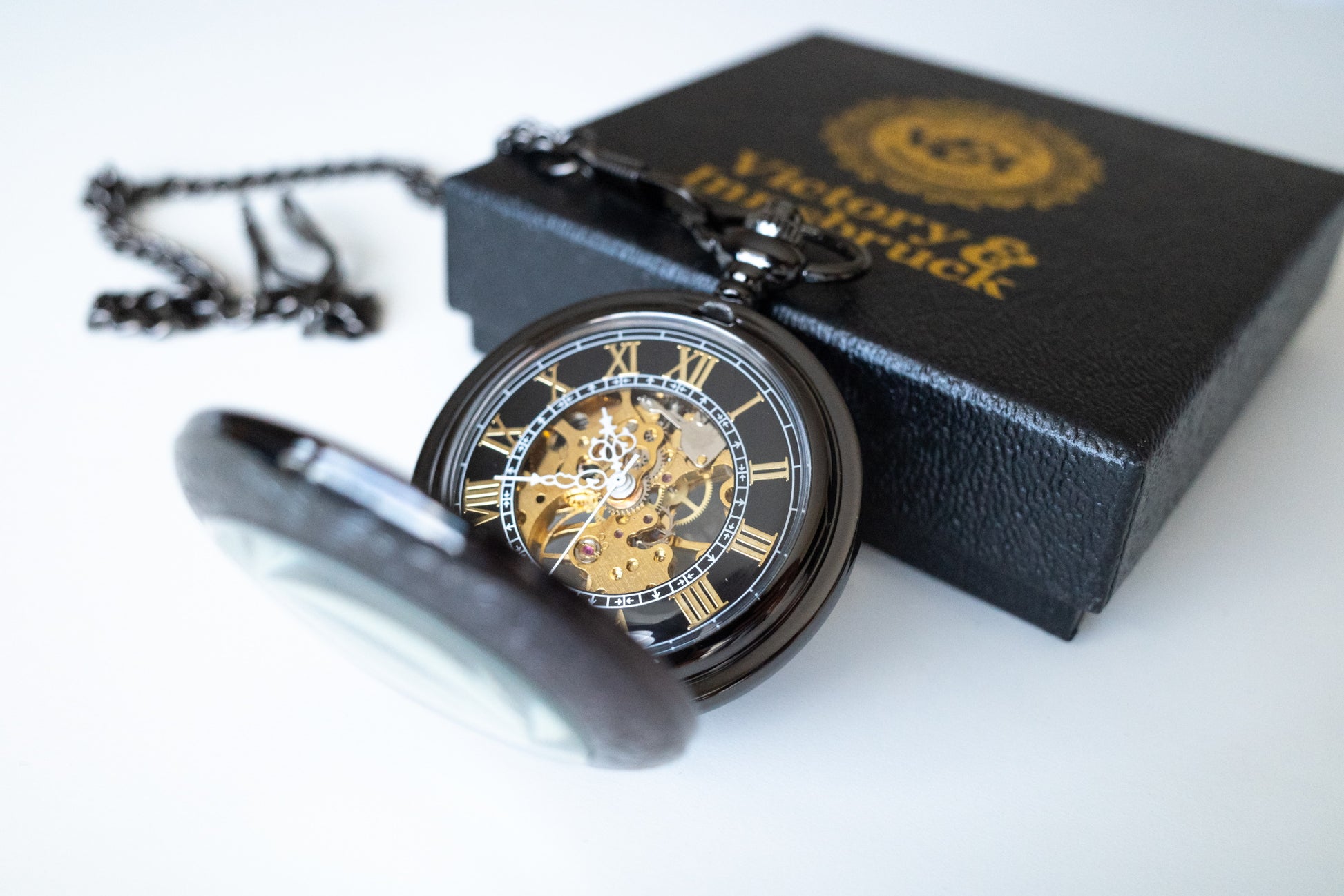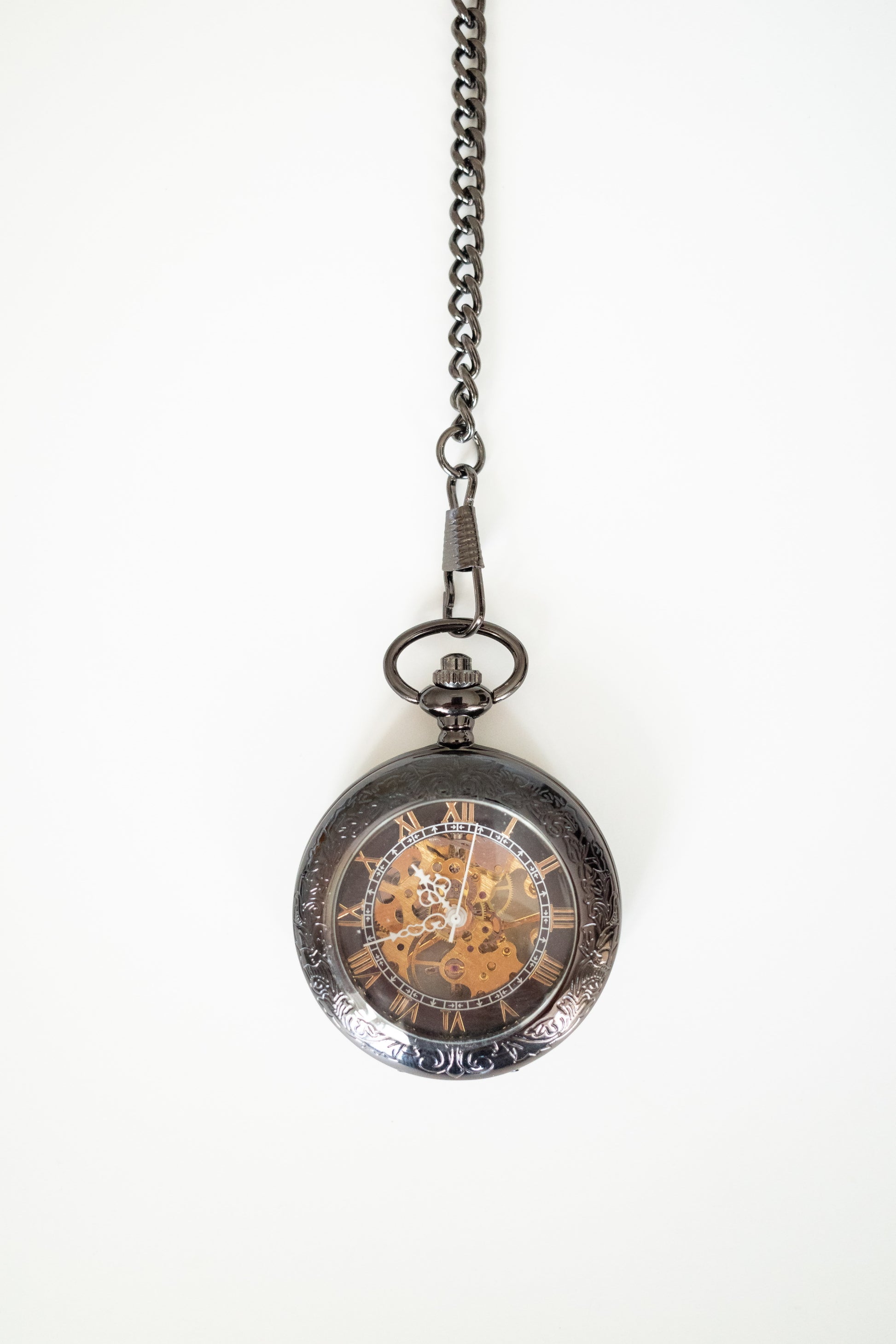 Featuring a detailed and stunning gold mechanism visible from both the front and rear with gold roman numerals, encased in a delicately designed gunmetal black surround that opens out with matching chain link.